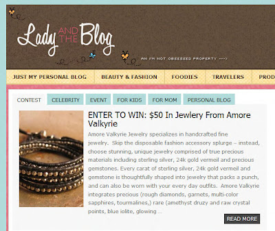 Win a $50 Gift Card to Amore Valkyrie Jewelry, hosted by the very lovely Lady and the Blog! This contest ends on May 14, 2011 at Midnight EST - so hurry!